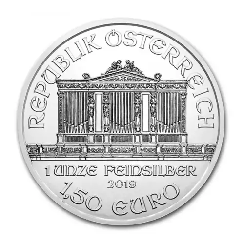 The Austrian Silver Vienna Philharmonic is a silver coin produced by the Austrian Mint. It is the most popular silver bullion coin in Europe. The coin is legal tender in Austria with a face value of 1.50 Euros. It weighs exactly 1 troy ounce of .999 fine silver. This Austrian Philharmonic silver coin has a beautiful design and is popular among all collectors and investors alike.